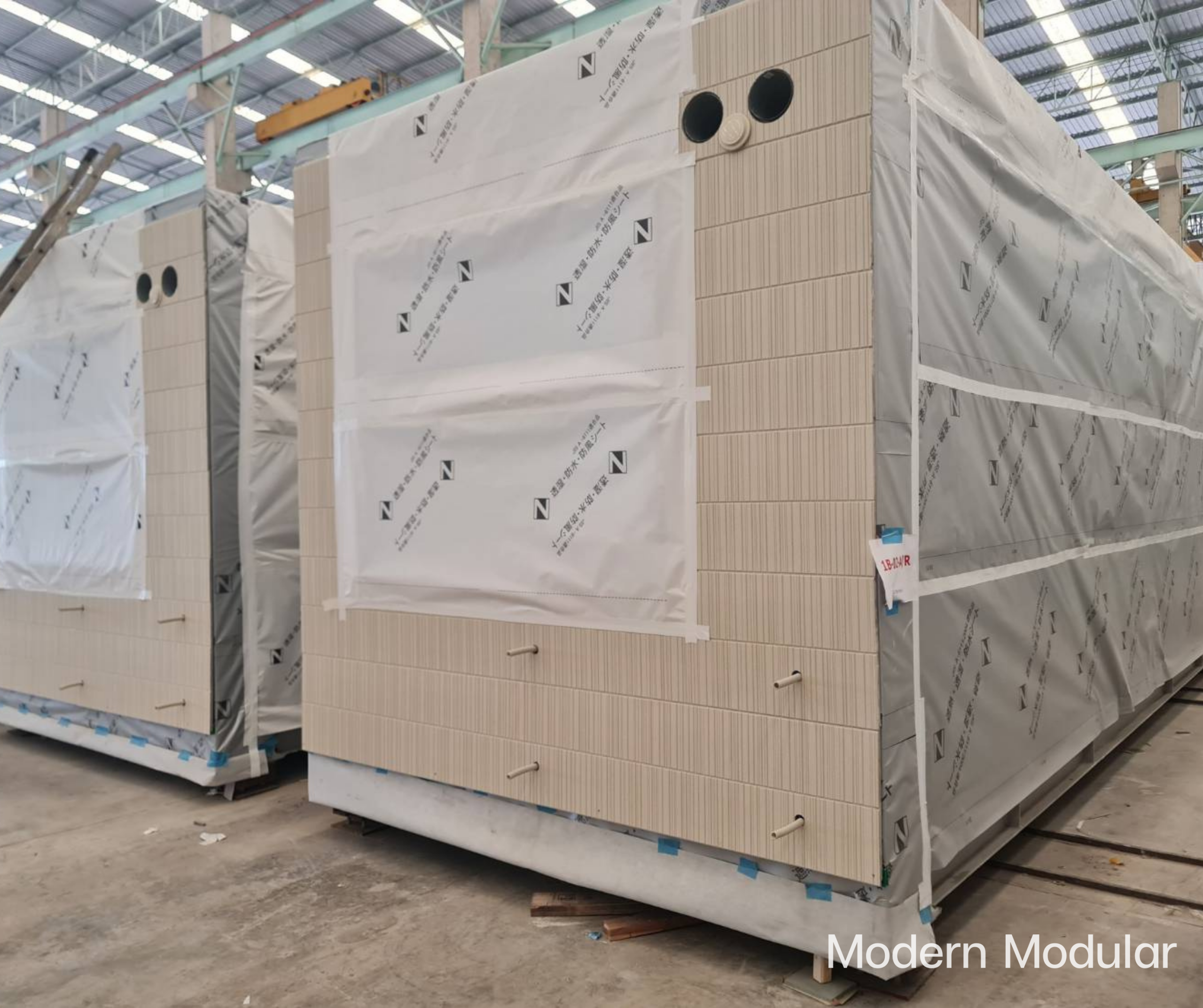 Components (walls, floors, roofs) are shipped separately for assembly.